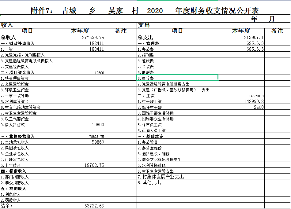 2020年度古城乡吴家村财务收支公开表